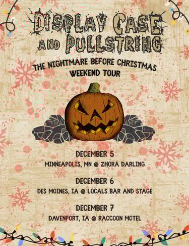We’ll be scaring people with our homies Display Case from Des Moines on our joint The Nightmare Before Christmas Weekend Tour. Our rock hard hard rock will be terrifying and not to miss!
