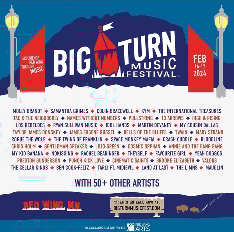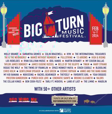 We're super excited to be a part of the Big Turn Music Festival in February 2024! This is such a great gathering of music artists from across Minnesota and the region. We'll be playing the Big Plate at 6:30pm - don't be late!