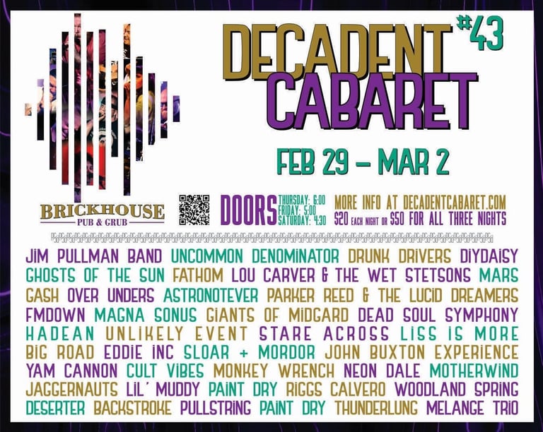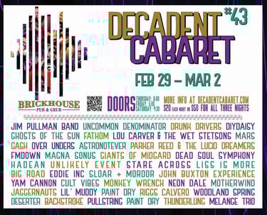 We're super excited to be a part of the newly expanded Decadent Cabaret in February 2024! This is such a great gathering of music artists from across the Chippewa Valley and beyond. We'll be playing the downstairs stage at 9:30pm - don't be late!